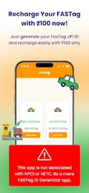 FASTag ₹100 är en gratis app för Android som gör det enkelt att skapa en UPI ID för att ladda ditt FASTag-konto. Genom att ange ditt fordonsnummer, vald bank och det önskade beloppet under ₹500, genererar appen en unik UPI ID som kan användas för att göra betalningar via alla UPI-aktiverade betalningsplattformar. Appen har en användarvänlig design och kräver ingen integration av UPI-betalningar inom appen, vilket gör processen smidig och snabb.